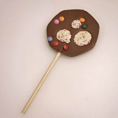 A delicious handmade milk chocolate lolly topped with mini chocolate beans in a crisp sugar shell & white chocolate jazzies.