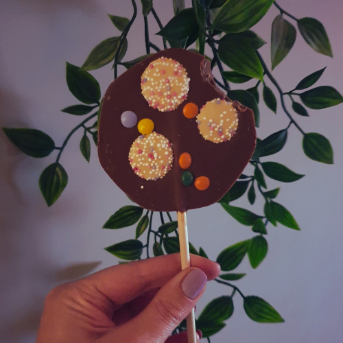 Handmade milk chocolate lolly topped with jazzies and chocolate beans.